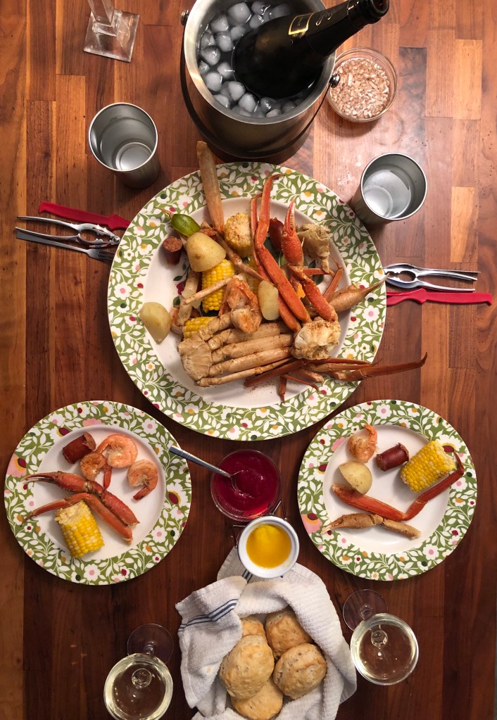 Not sure what in particular made me want to suddenly post again, after so much time away, but here is last night’s dinner at home—a crab boil complete with snow crab legs, corn on the cob, shrimp, potatoes, spicy sausage and biscuits. Old Bay seasoning. Cava to drink. Beet horseradish + ketchup for the shrimp and sausage, butter and honey for the biscuits. And mignonette. For whatever we felt like dipping into that sweet, yet pucker-inducing sauce.