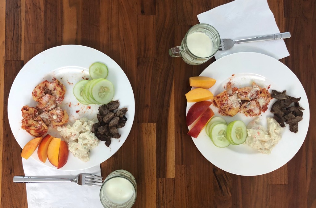 At some point, I know my kids (now 6 and 3!) will object to meals like this. The kind of meals I make them daily, which consist of leftovers or food I find in the pantry or refrigerator, with no regard to how the items “go” together, only that they cover a couple of food groups. Like Saturday’s lunch: tortellini with red sauce and Parmesan cheese, store-bought potato salad (big tub from Costco), Korean Beef Bulgogi, cucumbers (grown from our friend’s garden) and slices of fresh nectarine.