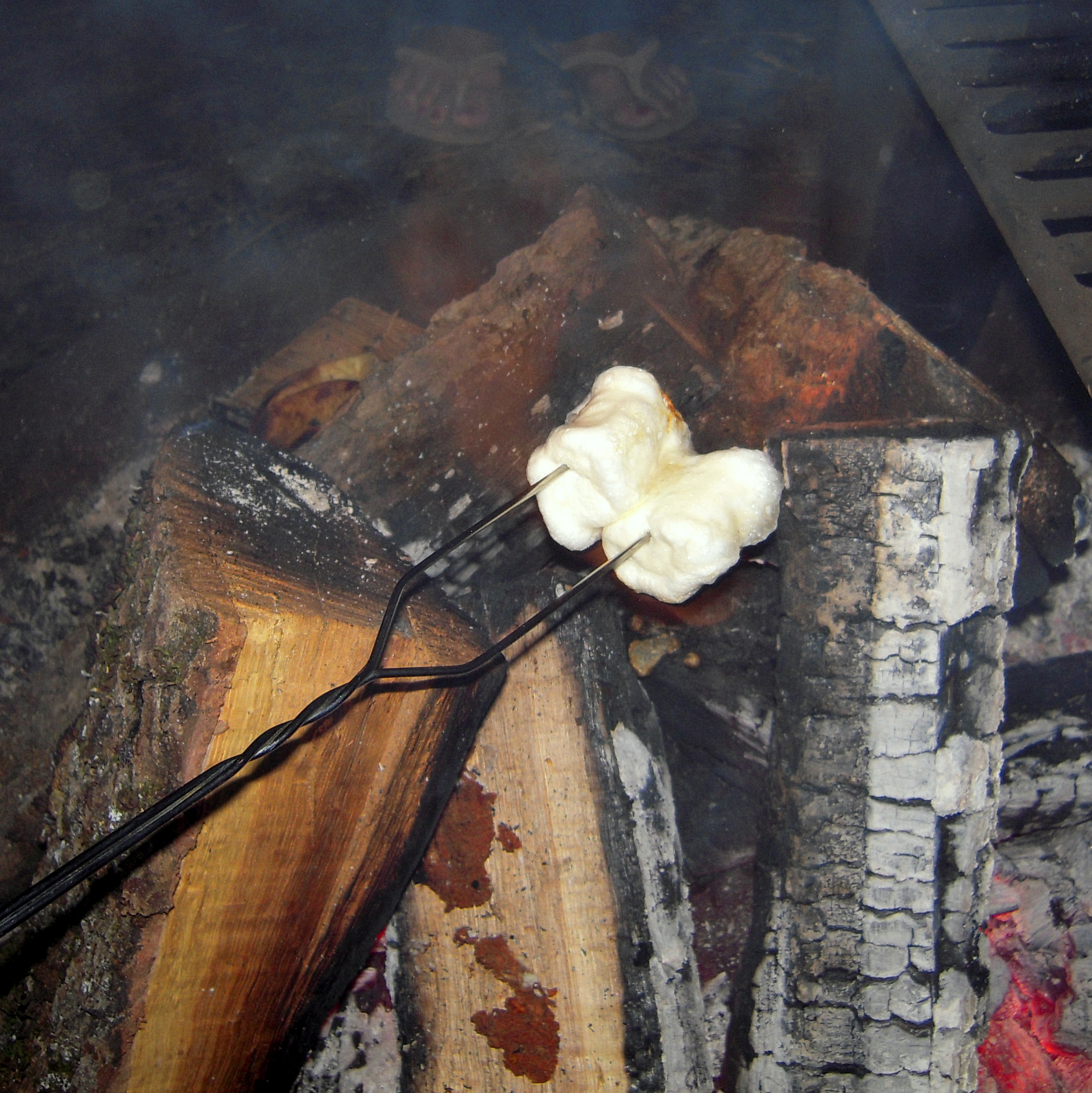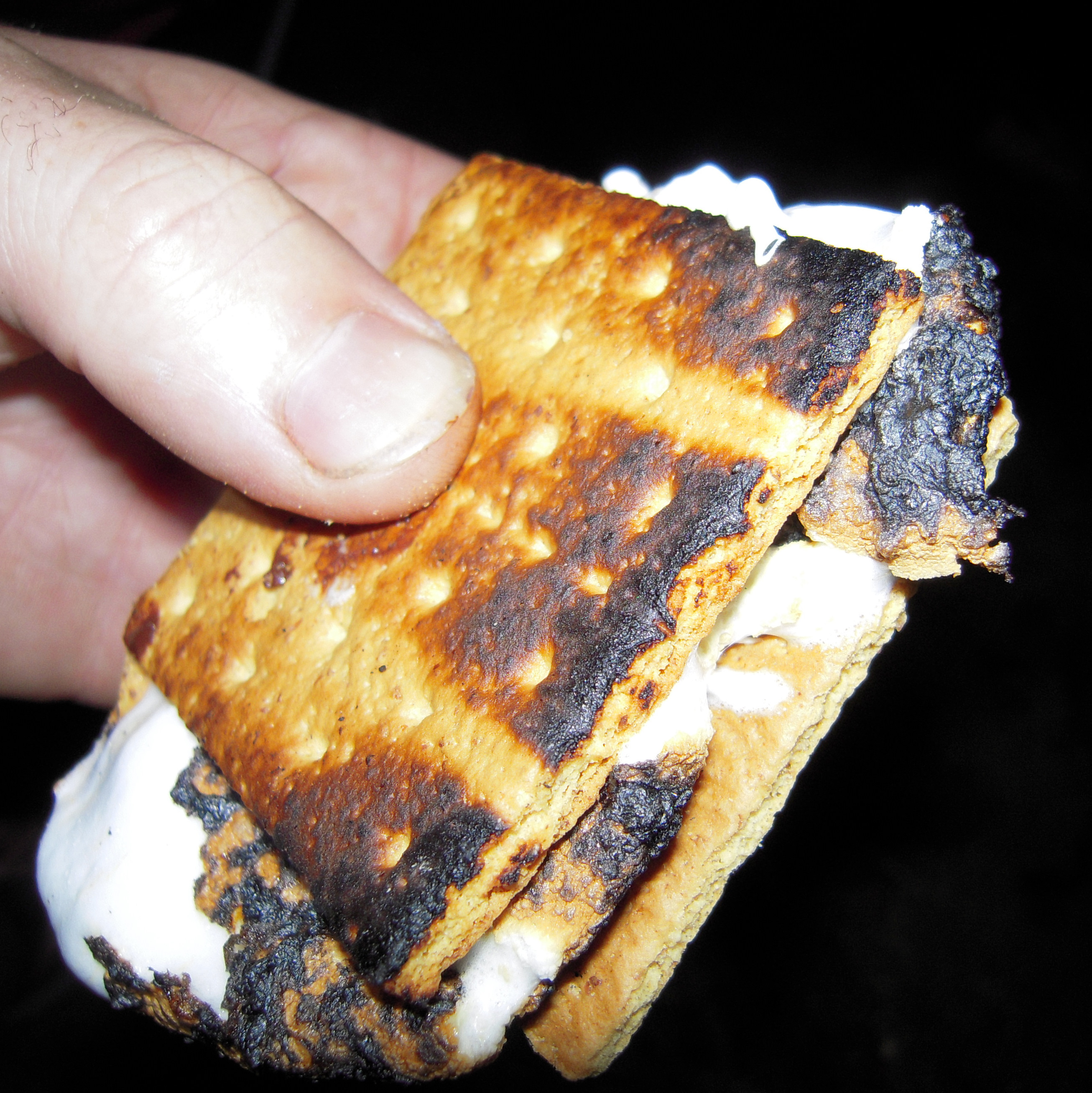 Now, I had to endure a bit of teasing for the degree of seriousness of which I took the s’more-making, and luckily Ken appreciated my scientific approach. Everyone laughed as I demonstrated my technique. I got out two graham cracker squares, placed two squares of Hershey’s Special Dark on top of one, and placed the graham crackers over the bbq grate part of the fire pit. While my chocolate was melting, two marshmallows were skewered and slowly roasted. Just before the marshmallows were so hot inside they were ready to melt off the skewers, I placed them on top of my graham cracker with melting chocolate, covered with the other graham cracker, and removed the skewer.