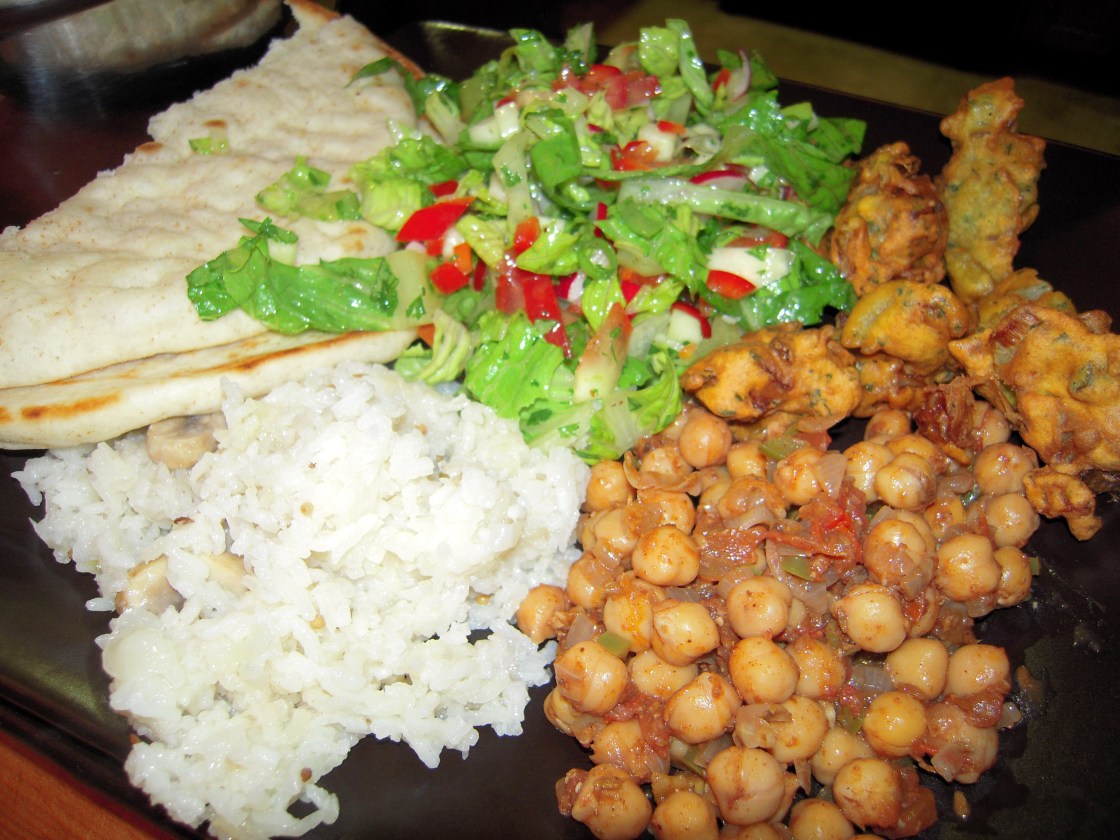 Our list of items to make from the cookbook: onion fritters, yogurt sauce with tomato and cucumber, and rice with mushrooms and mustard seed. Anjali used her own recipe for Chana Masala, which translates to spiced chickpeas. I knew it wasn’t Indian, but I included a toned-down version of the Lebanese Fattoush salad with Romaine lettuce, cucumber, tomato, green onion, radish, and the Sumac salad dressing.