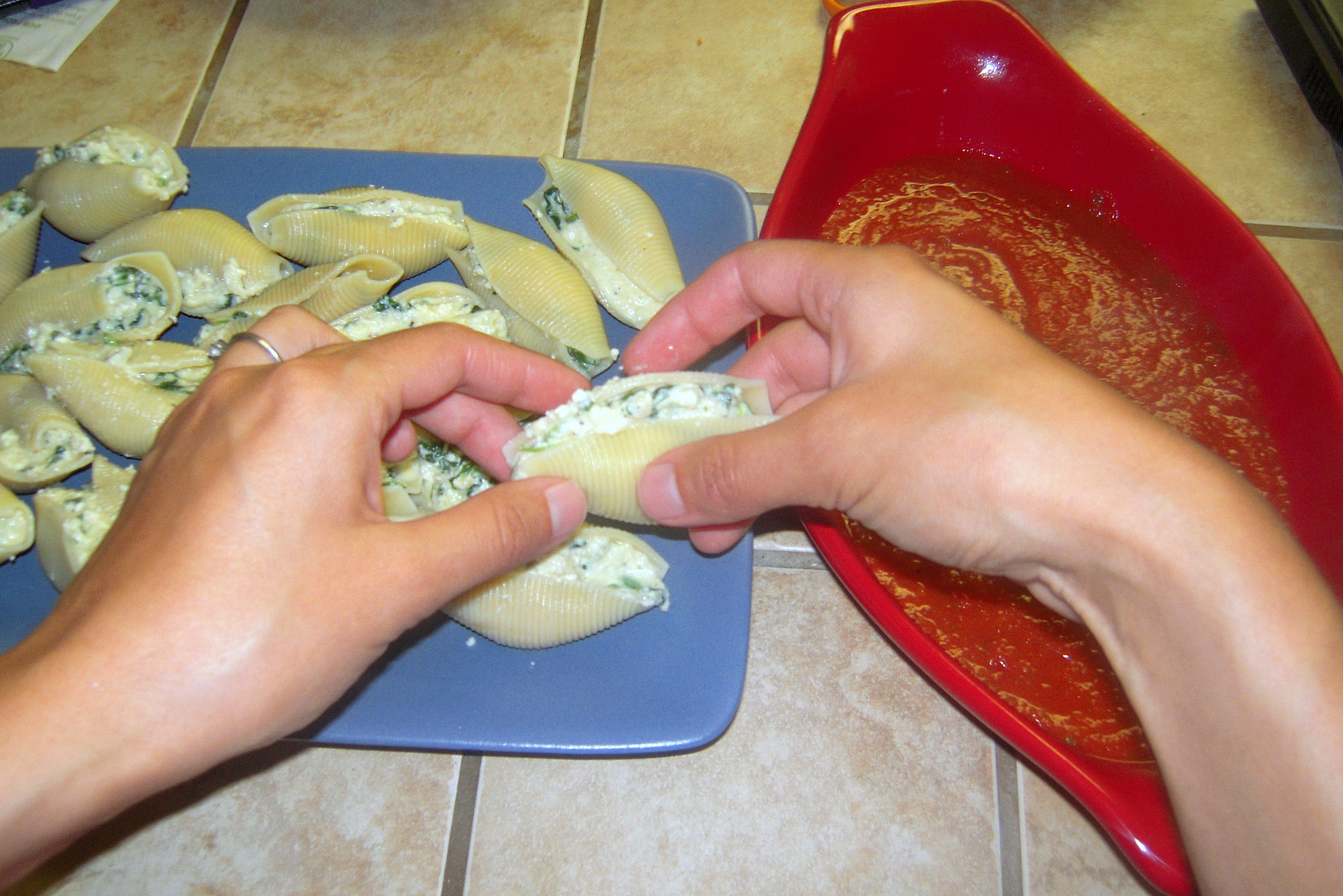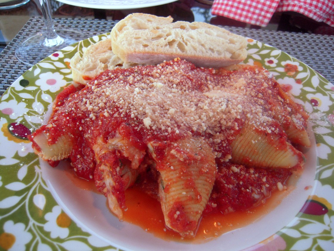 We recently made stuffed pasta shells and I realized, in making this meal, we were getting dangerously close to another kitchen gadget I have been putting off — the dreaded pasta maker. After the success of the stuffed shells, Jan’s thinking big: ravioli, tortellini, and–I know it’s coming. But, as we’ve yet to try the ravioli or tortellini with prepared dough, I’ll cross that bridge when I get to it.