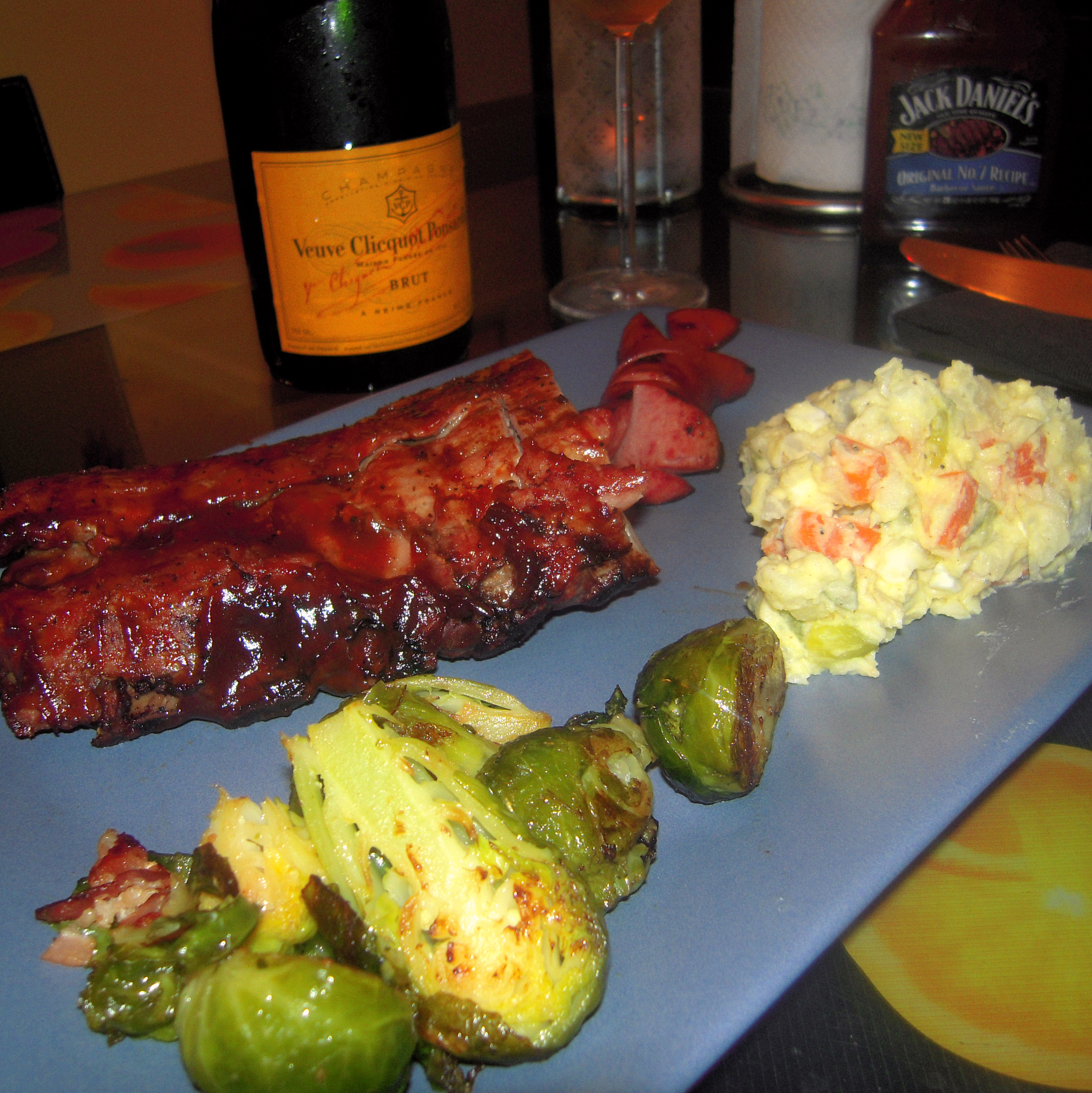 Ribs and Champagne might not be a traditional combination, but it ought to be. When paired with Jan’s version of brussels sprouts and Czech potato salad, all the components came together surprisingly well. I found brussels sprouts too bitter before I tried Jan’s take on them, which he sautéd in chicken broth and bacon.