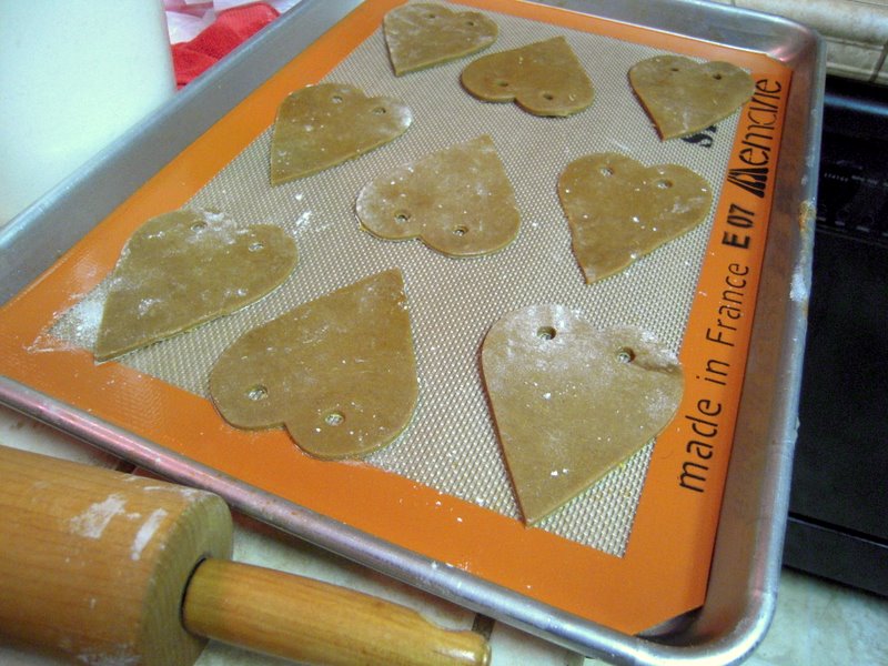The night before the party, when I was ready to make the cookies, I thawed the dough by placing in under a bowl of running water for about 20 minutes. On a heavily-floured board I used a rolling pin to roll out the cookies to about 1/8” thick. I used a heart shaped cookie cutter, and even though it was smaller than the pictures of Lebkuchen I’d seen online, I figured it would do. I took apart a Bic pen, rinsed the pen body, and used that to make two holes where the string would go in order for us to wear our cookies.