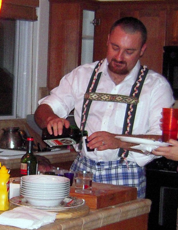 The theme was completed with the perfect outfits – I went to the Halloween store the day after Halloween to score 50 percent off on a costume simply named “Gretchen.” For Jan, we found him some plaid shorts and green suspenders, to which I sewed on ribbon with a heart and flowers pattern, along with a horizontally sewn thick green ribbon to complete the Lederhosen look. And some of my good sport friends joined in the chance to get another wearing out of a former halloween costume.