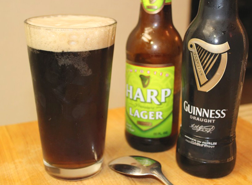 To wash it all down, we made Black and Tans, using Guinness Draught and Harp Lager.  To prepare, we filled the glasses about 1/2 of the way with the light colored beer (Harp Lager), then poured the dark beer (Guinness Draught) over an upside-down spoon to fill the remainder of the glass without splashing and mixing the two layers.