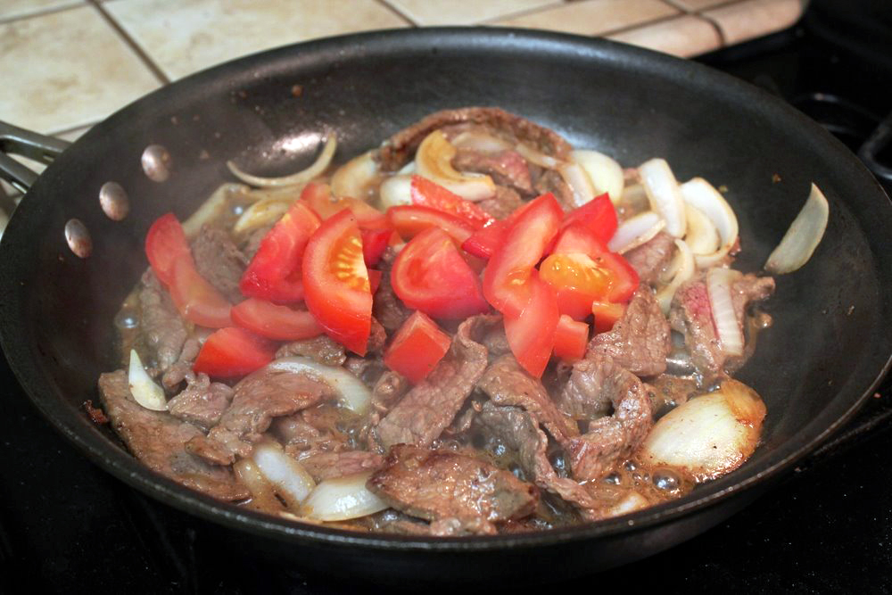 Lomo Saltado reminds me of a few things I love: beef fajitas, chili cheese fries, and Asian stir fry.  Not dishes I would ordinarily group together in the same sentence, but somehow, it seems to work.  After all, I wouldn’t give a second thought to eating a steak sandwich with onions and tomatoes along with a side of French fries.  So if I could get that same meal without the bread, why not?