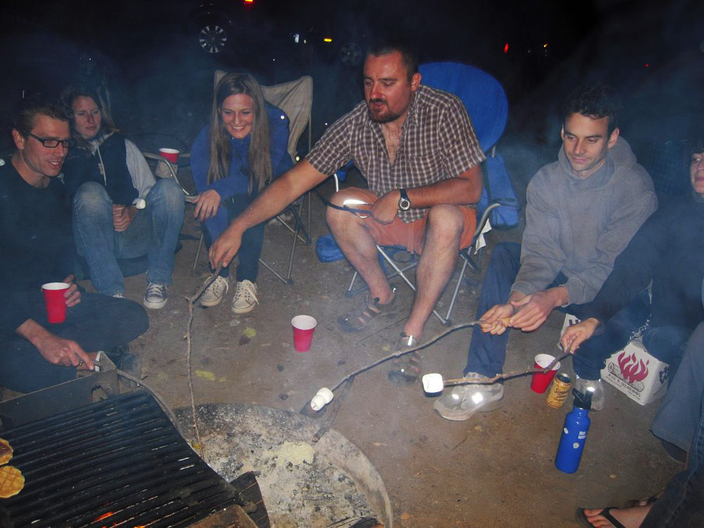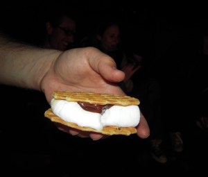 Everyone had their own ideas about what combinations they wanted to try: Belgian Butter Waffle Cookies with Belgian chocolate, open faced s’mores, untoasted grahams, etc. and they got to work constructing their own treats. As usual, there was the great debate about slowing browning the marshmallows verses catching them on fire and quickly burning it out. Jan argued that the more fiery technique allowed for the marshmallow’s sugars to caramelize, while I argued that my slow-turning technique near the hot ashes got the entire marshmallow heated completely through. But this wasn’t a new debate and everyone concentrated on making their own s’mores. I had the fun of watching each person work on their own creation and combinations of ingredients.