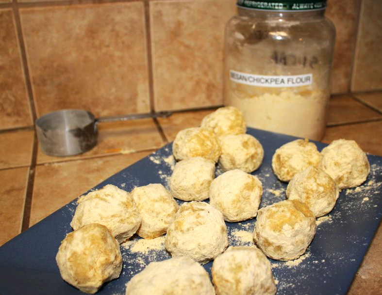 One night, the combination of dishes was right on. With the chicken on the grill and the cabbage on the stovetop, we followed the recipe for Indian Mashed Potatoes or mash aloo. We reserved a portion of the mashed potatoes that were prepared according to the recipe (delicious this way), and the other portion was an experiment sparked by something we’d heard about on a cooking show. By searching for more Indian recipes online, we found what we were looking for: mashed potato balls, though the more appropriate name was batata vada, which translates to “potato fritters.” To make them, we rolled ping-pong-ball-sized pieces of mashed potatoes into chickpea flour (besan) that had turmeric added to it. I deep fried the mashed potato balls until the outsides looked golden brown and crispy.