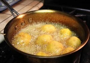 Since the mashed potato balls were so delicious, I decided we’d make them for an Indian food themed dinner party we were hosting. And since I was so excited about my newly acquired tool for forming meatballs (looked like scissor handles with ice cream scoops on each end), I thought that would help me make perfectly shaped mashed potato balls. That, however, proved to be a mistake. Because I hadn’t formed the balls by hand, the potatoes were not firmly pushed into shape. When they were deep fried, they quickly began to fall apart. So after all that, what we ended up with was basically just mashed potatoes that had a lot more grease in them than if we’d just left them alone.