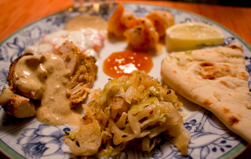 A few other lessons learned: the marinade for the spicy grilled chicken (following proper food safety and reserving some separately from what is used for marinating the chicken) makes an amazing sauce to dip naan, potatoes, cabbage, and anything else on the plate. Also, Trader Joe’s is a great place to buy naan—they offer several different varieties in their freezer section, and they heat quickly and perfectly in the oven at home.