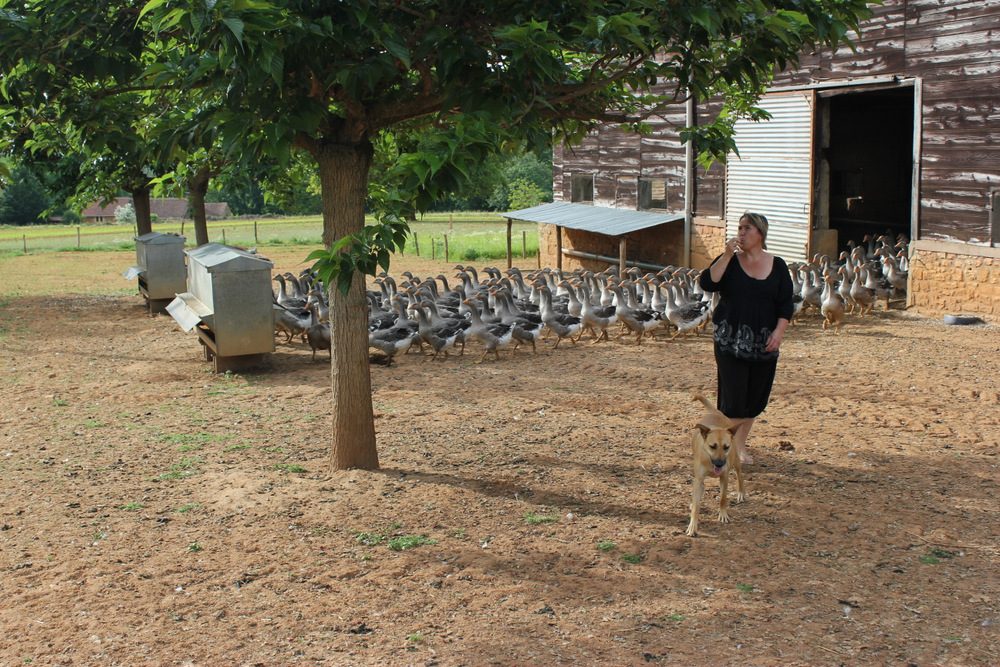 Me, Jan, and several other visitors gathered for the daily 6:30 p.m. tour at Elevage du Bouyssou, a small goose farm run by husband and wife Denis and Nathalie. Nathalie took us around to different parts of the property where we first met the baby geese, and then the teenagers, each age group kept separately from the others.