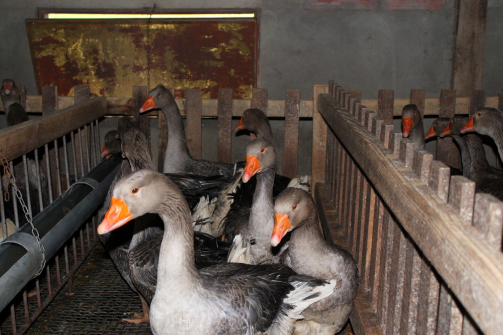 Nathalie explained that the geese live on this farm from when they arrive as babies, up until just under 1 year old. Here, they are free to roam the farm on their own to eat grass and corn.