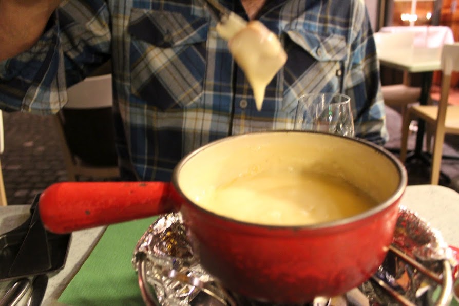 Rewind back a few days: At Restaurant Swiss Chuchi, we indulged in fondue even though eating fondue in summer is so touristy, we were told (apparently it’s a winter thing).  But we didn’t care.  We had to have it in Switzerland.  And while it was good, I would have been satisfied with just a cup of cheese to dip bread in, verses a large pot.