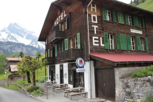My first glimpse of this came when Jan and I headed into Berner Oberland, in the Jungfrau mountain region of the Swiss Alps.  After a lunch of “Kebap” in Interlaken, we drove to Stechelberg (and no, that’s not a typo, it’s Switerland’s take on Kebab with the delicious addition of French fries wrapped inside).  Here, we parked our car, grabbed our pared-down bags (we would be walking a ways uphill to our hotel), and boarded the Schilthorn gondola up to the car-free village of Gimmelwald.  As we waited, we observed the happy mix of cows and paragliders, both courteously making way for one another as the paragliders sailed breezily down into the lush valley from the alps towering above.