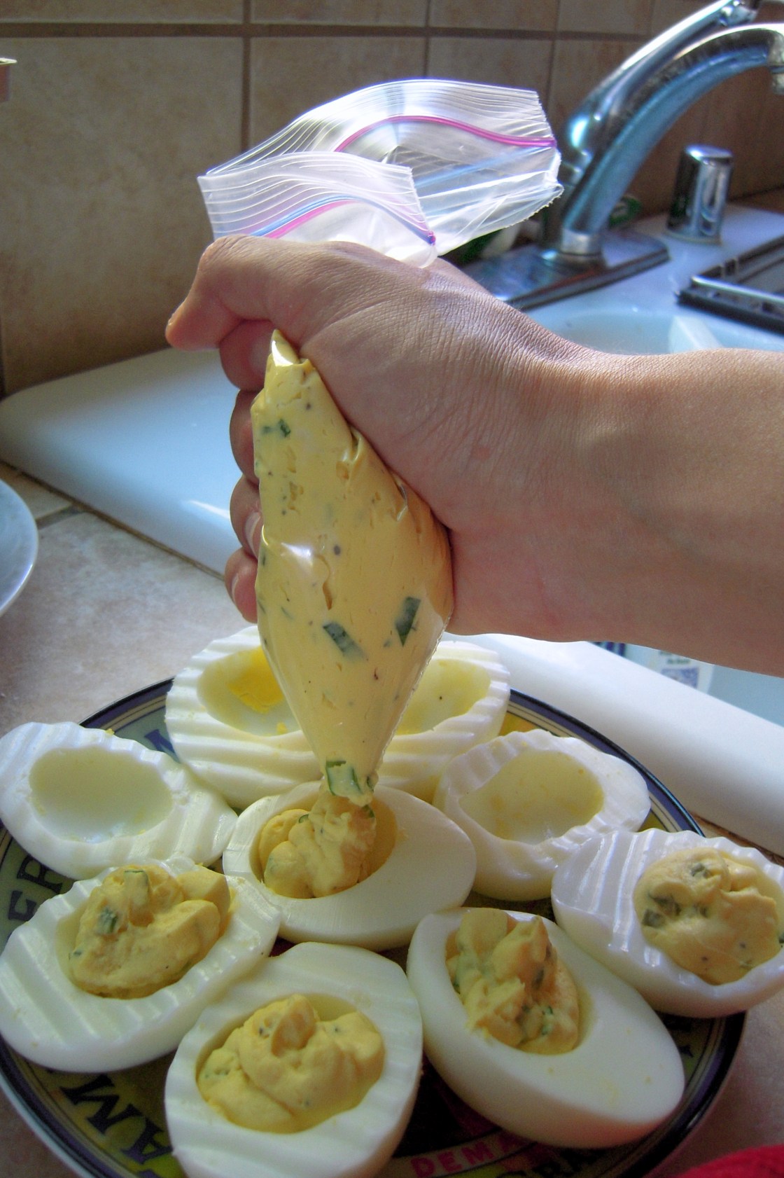 I added horseradish to mine for some kick, and also tried out another technique picked up from the Food Network: impromptu piping bag. I put the egg filling in a plastic bag, cut the end, and was able to create clean-looking deviled eggs! (Which is definitely an improvement over my usual messy spoon technique.)