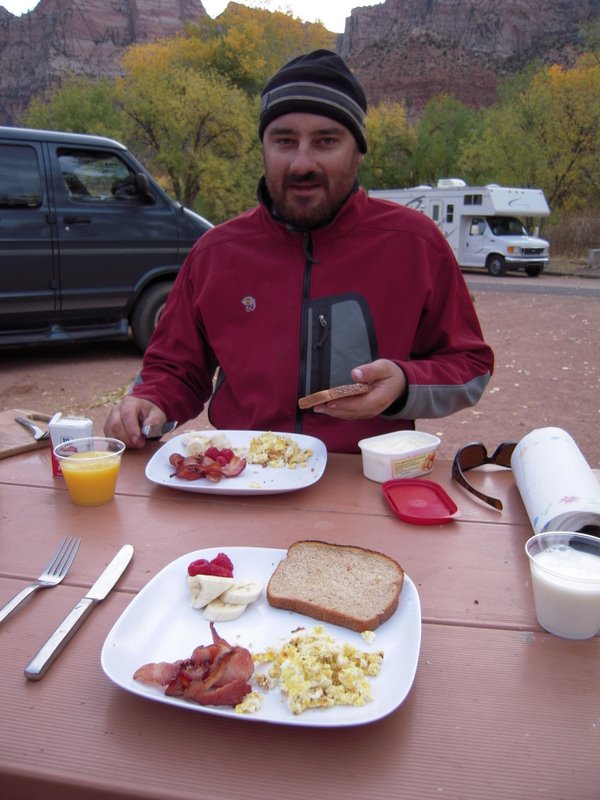 At camp in Bryce Canyon National Park, UtahPizza bread made on the grillPotato, egg and bacon skillet in Arches National Park, Utah