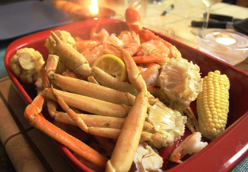 It was just not my day. But then, as I too was about to turn into a sobbing mess of puff pastry gone melty and whipped cream gone chalky, Jan pulled out a 2 pound bag of snow crab clusters from Fresh and Easy. In a matter of minutes, he boiled the crab legs, boiled some shrimp, and boiled some corn on the cob. And the day was saved by Jan and a big boiled feast. I was so hard at work with the shell cracker, trying to get the crab meat out so I could squeeze lemon juice on it and dip into melted butter, all my baking problems faded away. Well, of course, after I strategized my game plan for reattempting those baking projects another day.